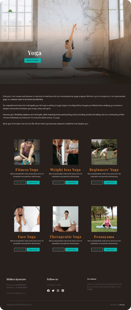 Lastly, the Yoga section showcases various courses, each with two actionable options: “View Details” for course information and “Book a Slot” to reserve a spot. This structure ensures an informative and user-friendly journey throughout the site.