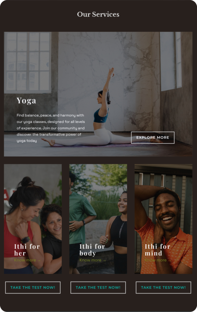 The Ithikca.com website is designed to guide users through a seamless experience. The hero section features a prominent “Book a Demo” button, allowing users to quickly open a form and schedule a demo. Next, the Our Services section highlights three offerings—Ithi for Her, Ithi for Body, and Ithi for Mind—each with two options: “Know More” for detailed information and “Take the Test” for a user assessment.