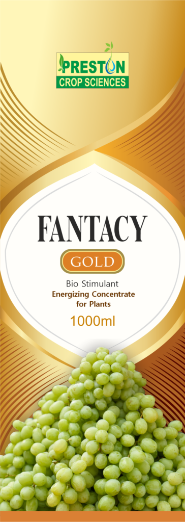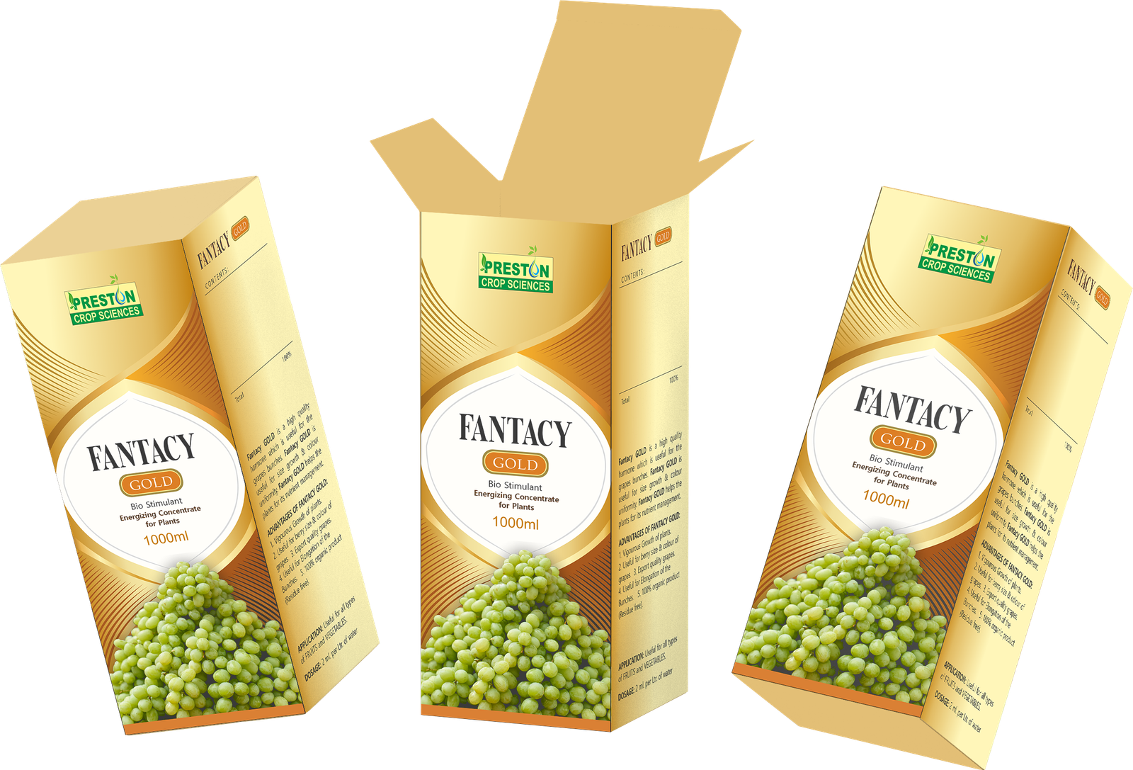 The packaging box is designed to exude elegance and premium quality, reflecting the high standards of the Fantasy brand. Crafted with a golden base, the design complements and contrasts the green logo of the company, creating a harmonious yet striking visual impact. The golden hues not only stand out as a sophisticated choice for an agro product but also emphasize the exclusivity and premium nature of the product.
